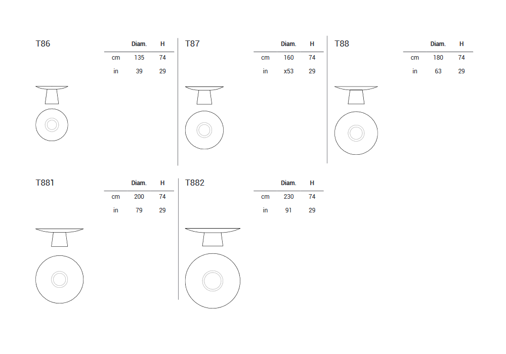 | Dimensions | - Ø 135 x H 74 cm; - Ø 160 x H 74 cm; - Ø 180 x H 74 cm; - Ø 200 x H 74 cm; - Ø 230 x H 74 cm. |