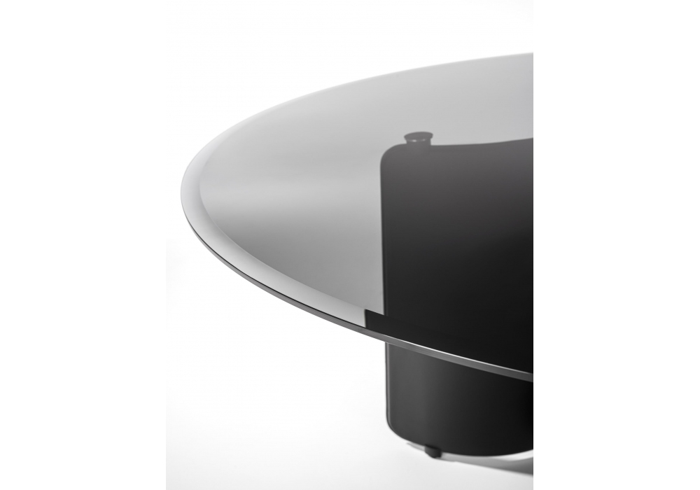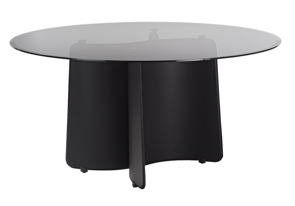 Butterfly designed by Studio Nove.3 for Enrico Pellizzoni is a round table with central base in folded sheet metal covered in leather. Round glass top, available in different finishes and sizes.