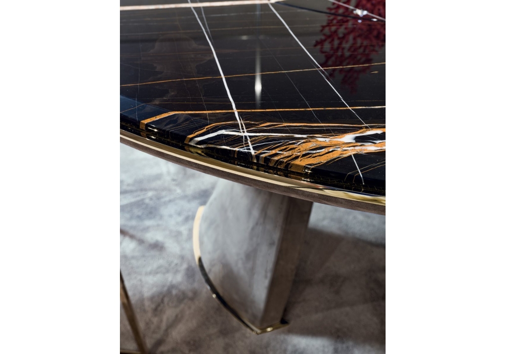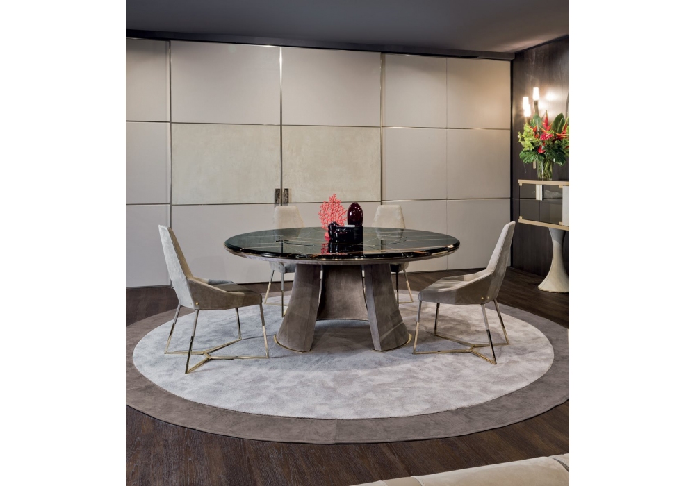 Damien Round designed by Giuseppe ViganĂ² for Longhi is a round table with three-legged base made with high-density structural foam mold and covered in leather. Metal parts with glossy or matte finish and marble or mirror top with recessed swivel; metal studs recessed into the top. Possibility of inserting an electric linear actuator that moves the turntable to allow cleaning and maintenance. On request Lazy Susan turntable in different sizes and finishes.