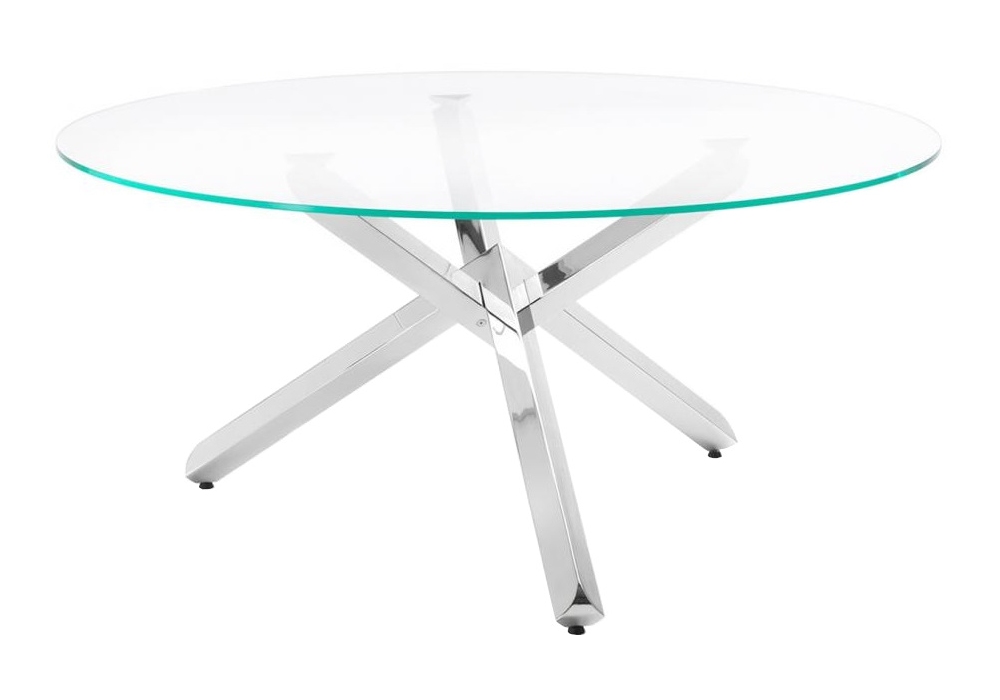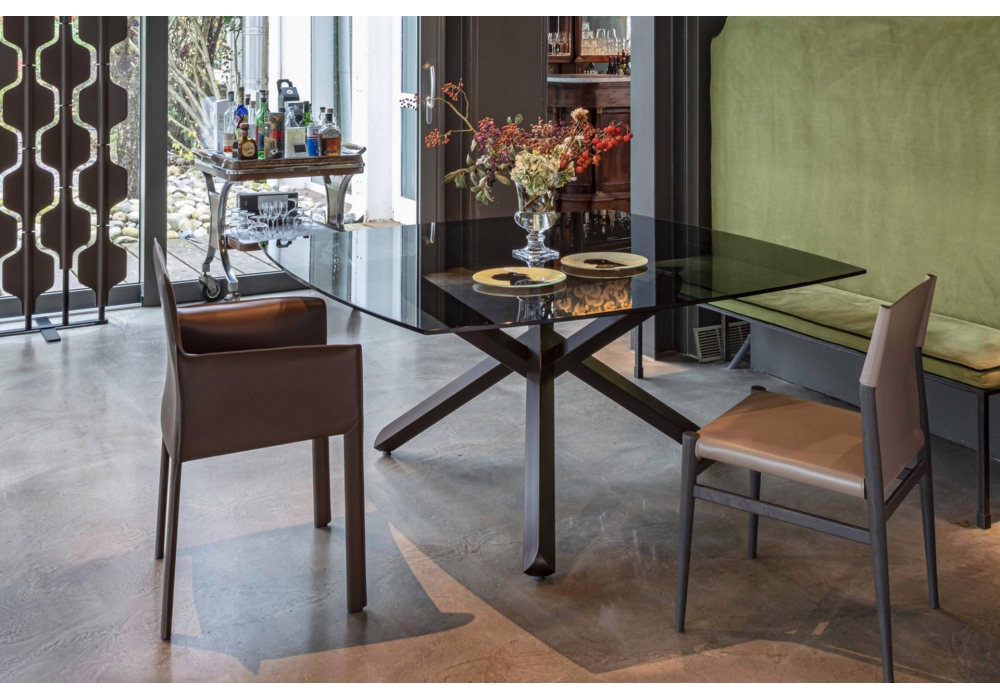Verve designed by Giulio Manzoni for Enrico Pellizzoni is a table with central base in two models available, finishing in polished, satin, painted or covered in leather stainless steel. Transparent glass top.
