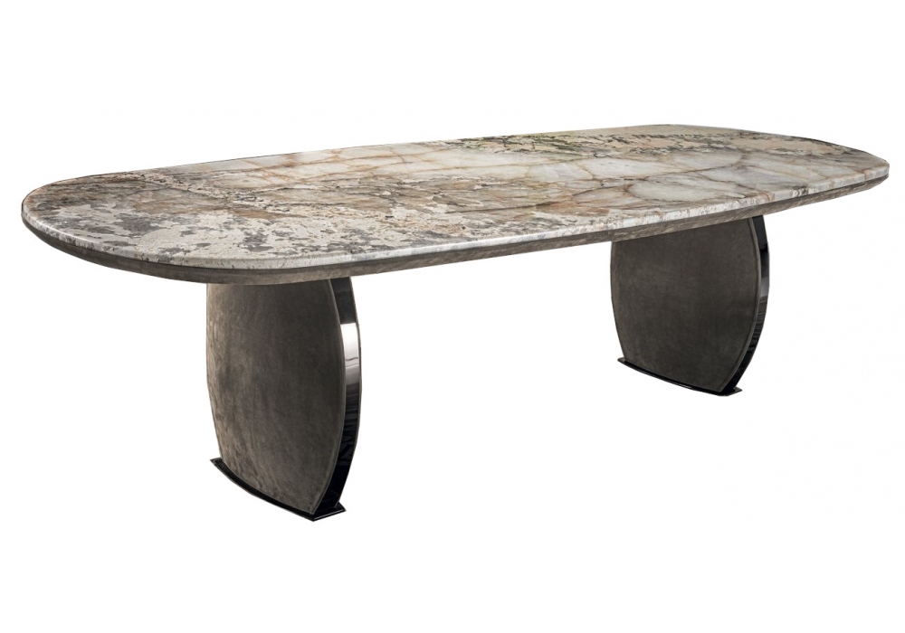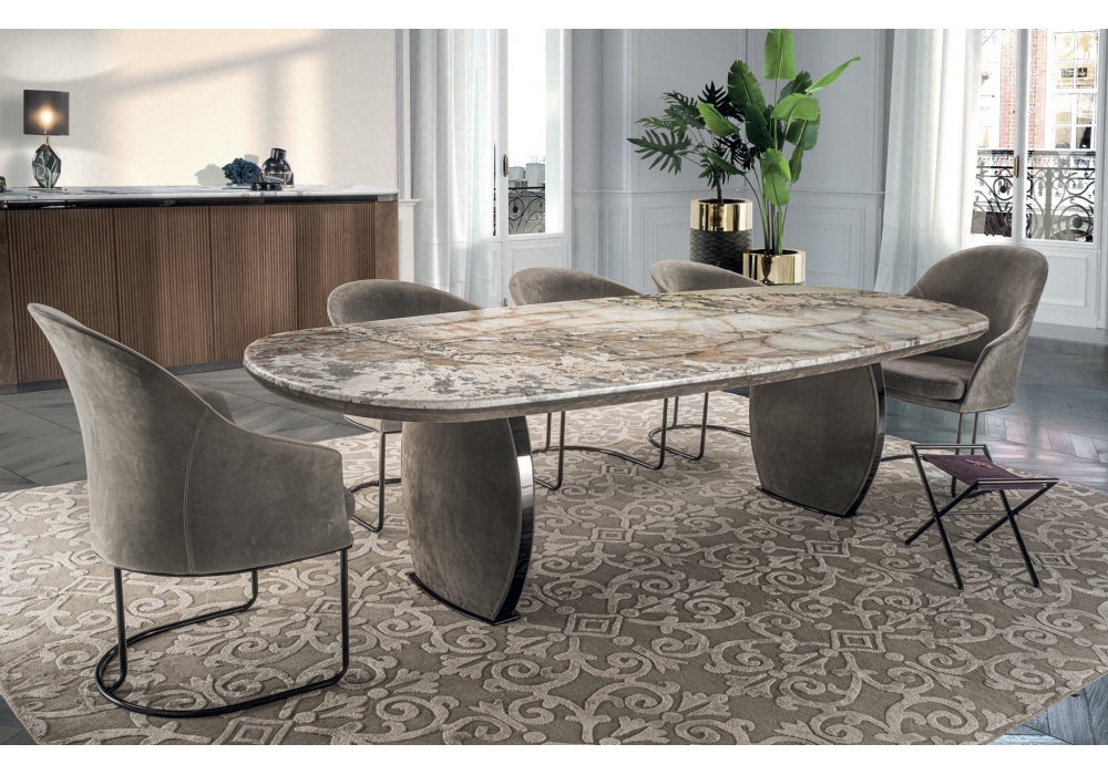 Lotus designed by Giuseppe Iasparra for Longhi is a table with legs made with high density foam mold and covered in leather with shiny or matt metal parts. Marble top and undertop in leather to match the legs. Upon request, it is possible to embroider “Marlène” on the leather that covers the leg. Available in different dimensions.