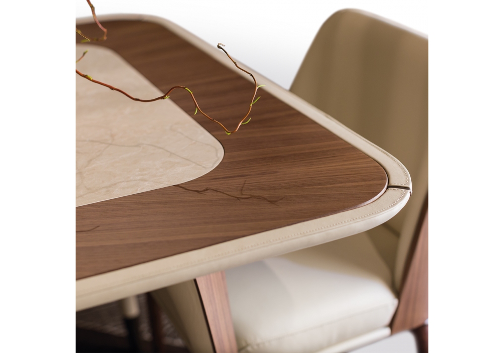 Melting Light designed by Andrea Bonini for Turri is a table with structure in solid wood and MDF with walnut veneer. Walnut veneered top or with marble insert. Metal parts in brushed gold or bronze finish. The edge of the table is covered in different leathers.