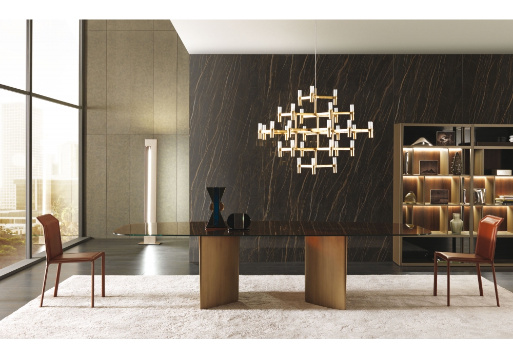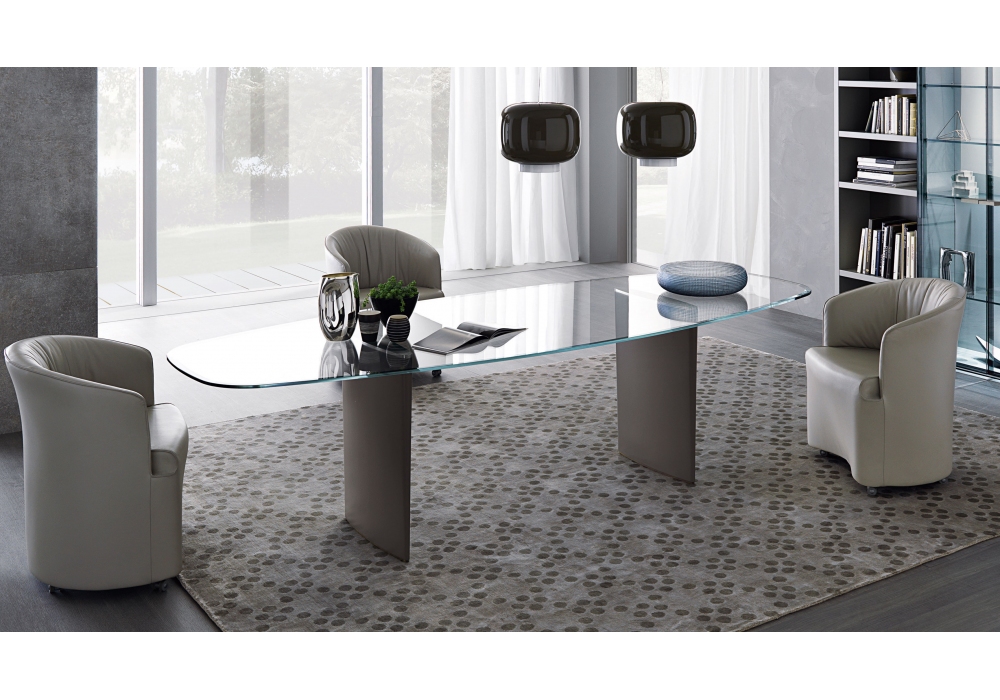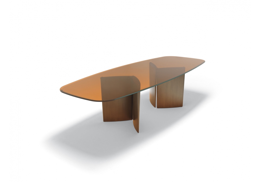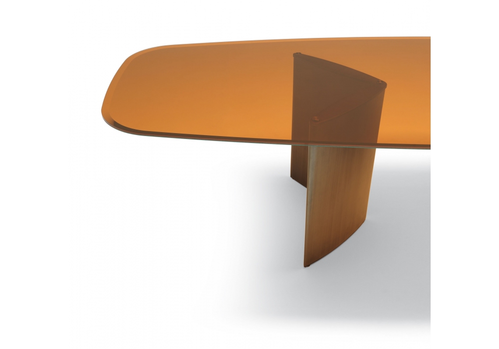 Ala designed by Ferruccio Laviani for MisuraEmme is a series of tables with wooden base in essence, matt lacquer or antiqued matt lacquer. Semi-oval shaped top with marble top in all variants or glass top.