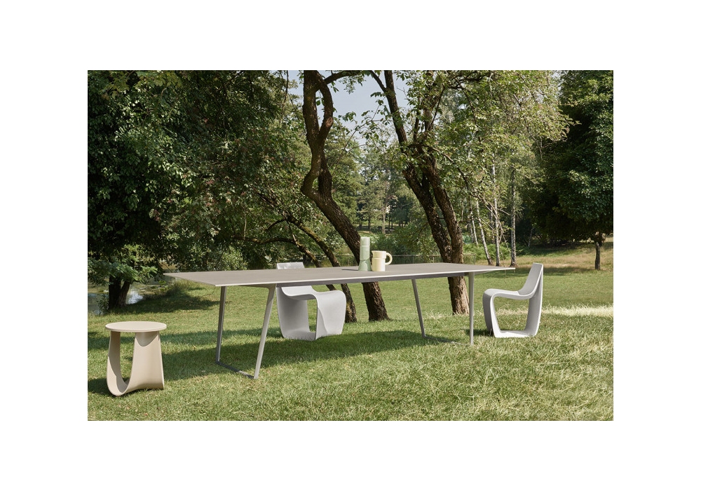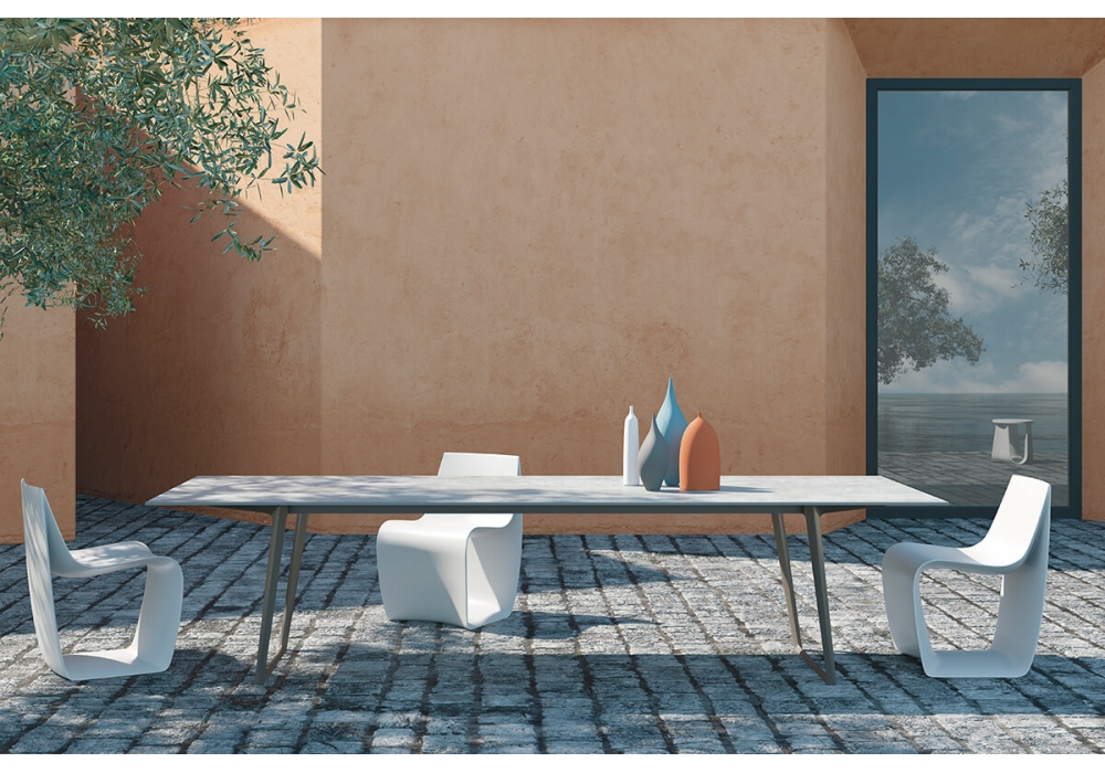 Axy Comfort designed by Claudio Bellini for MDF Italia is a rectangular table with top made of different materials, flush with the structure both in length and width. The supporting surface and the legs are in painted aluminum in 2 colours. The table, if made with a ceramic top, can be used outdoors. Available in various sizes.