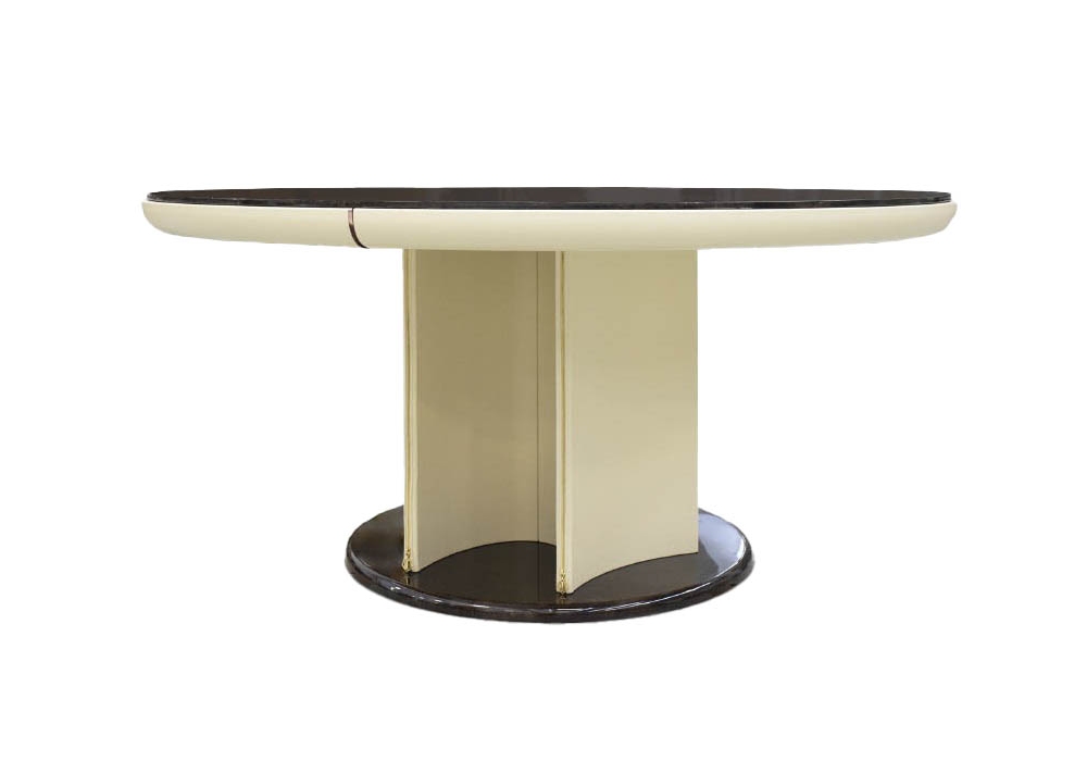 Noir designed by Andrea Bonini for Turri is a round table with structure and top in MDF and chipboard panels in glossy lacquered finish. Upholstery in different leathers. Available in different dimensions. On request it is possible to add the Lazy Susan rotating top in marble.