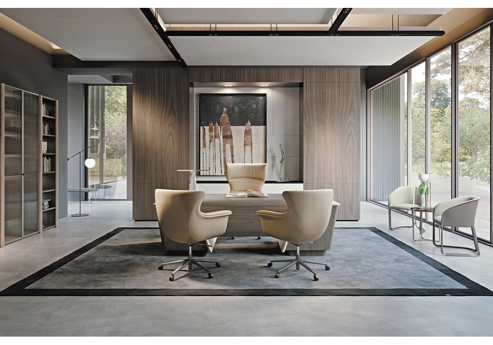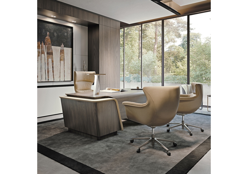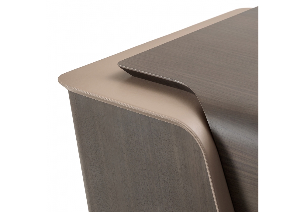 Blues designed by Giuseppe Viganò for Turri is a desk with structure made of particle board panels veneered in walnut and plywood with leather covering. Available in the version with chest of drawers in walnut wood or covered in leather.