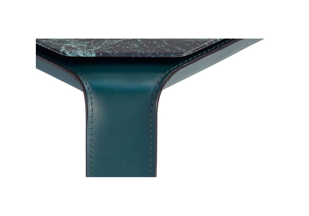 Cab Tab designed by Mario Bellini for Cassina is a table made with leather structure in natural shades, selection of reds, blacks and browns, green and blue and wooden or marble top. Available in different finishes and dimensions.