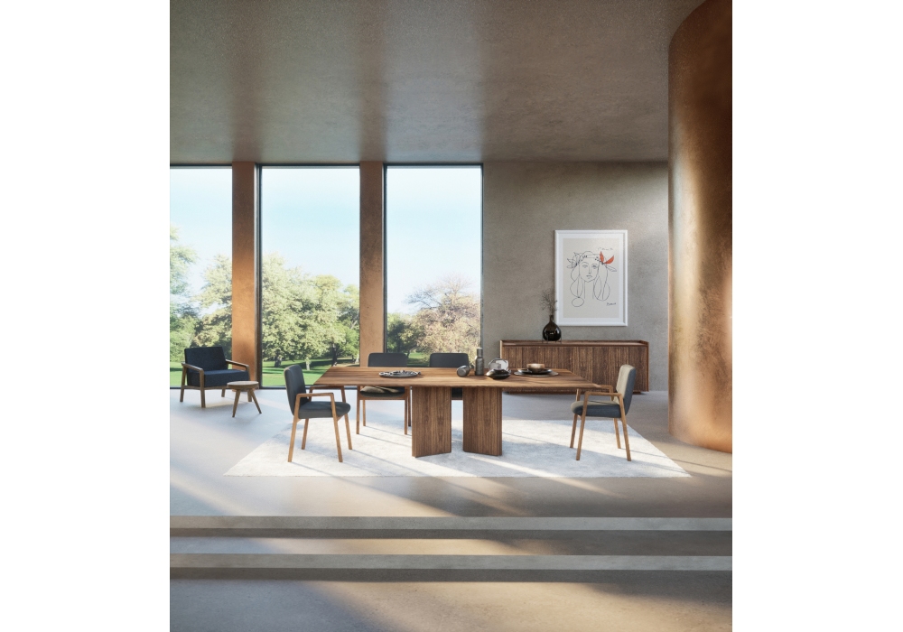 Revo designed by Giuliano & Gabriele Cappelletti for Riva 1920 is a table with top made entirely of solid wood with thinned-thick glued boards. The base is made up of prism-shaped legs, each characterized by three solid wood vertices, and by smooth surfaces or with Fresart workmanship, which creates a modern and dynamic geometric effect.