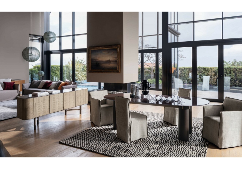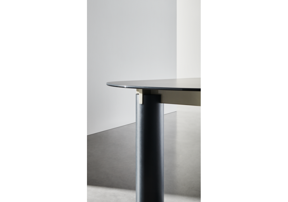 Daen designed by Federico Peri for Gervasoni is an oval table with fixed top. Legs in lacquered MDF and frame in glossy painted steel. Top in porcelain stoneware coupled with bronze-colored glass, painted glass underneath or in white Carrara marble. Available in different finishes and dimensions.