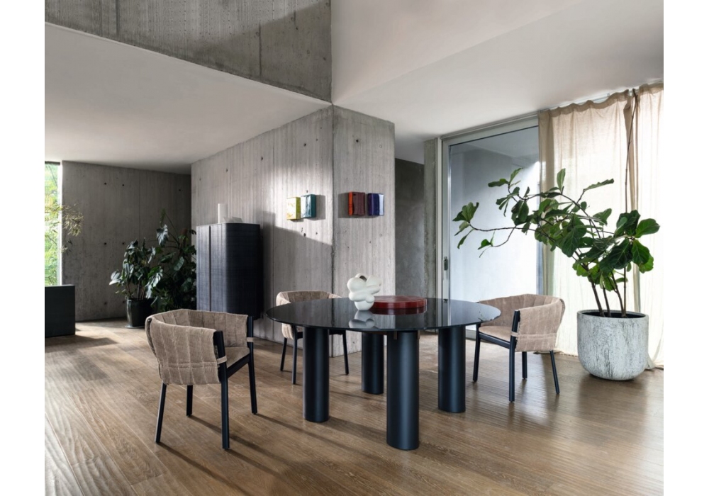 Daen 36 designed by Federico Peri for Gervasoni is a round table with fixed top. Legs in lacquered MDF and frame in glossy painted steel. Top in porcelain stoneware coupled with bronze-colored glass, painted glass underneath or in white Carrara marble. Available in different finishes.