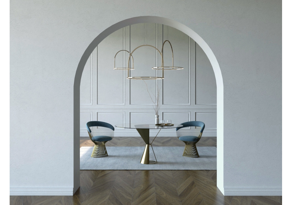 Essential designed by Serra By Milia for Escooh is a round table with base made up of two overlapping truncated conical elements in metal or wood veneer. The top is made of glass, wood or marble. Available in different dimensions.