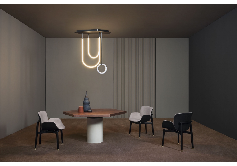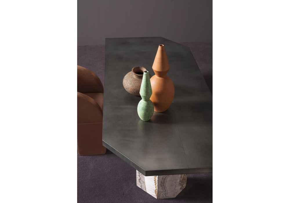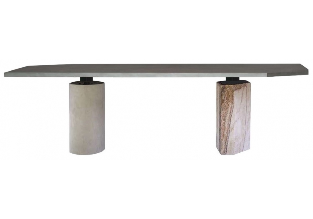 Jupiter designed by StudioPepe for Baxter is a table with honeycomb-core top covered with material by choice with matte varnish. Curved poplar cylindrical-shaped leg finished with Terra Cruda concrete (mineral waterproof finishing, semi-deformable mono-component cementitious material) hand-paddled by master craftsmen and plywood contoured leg with irregular shape with stone covering with waterrepellent protective oil. Connection plate in matt black metal. Available in different dimensions.