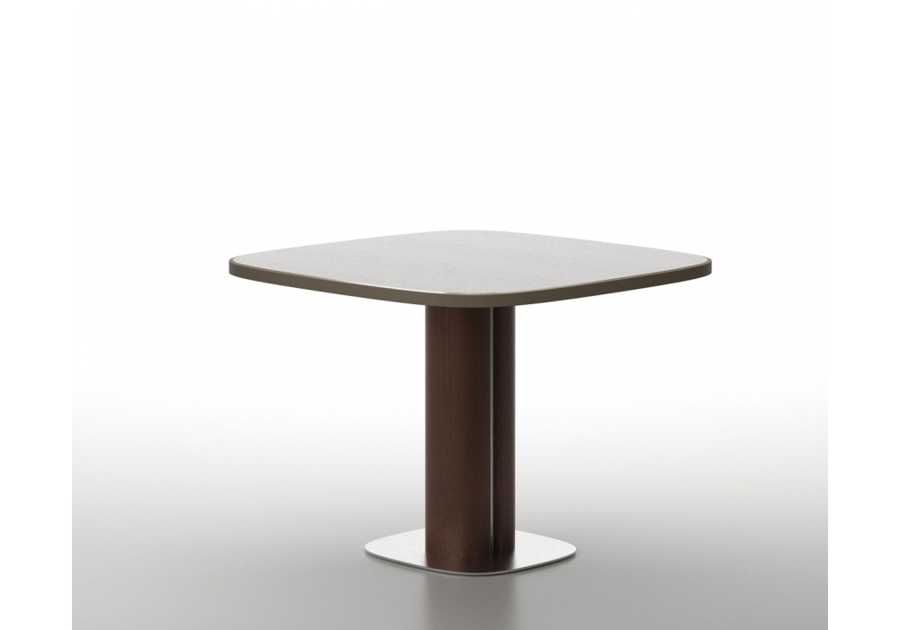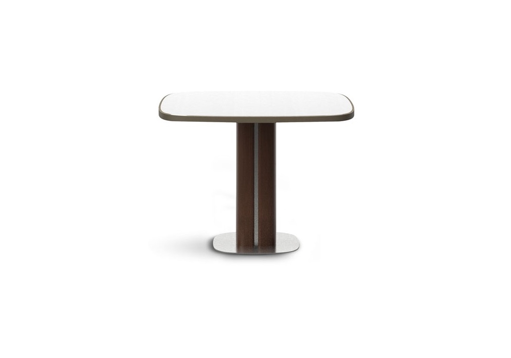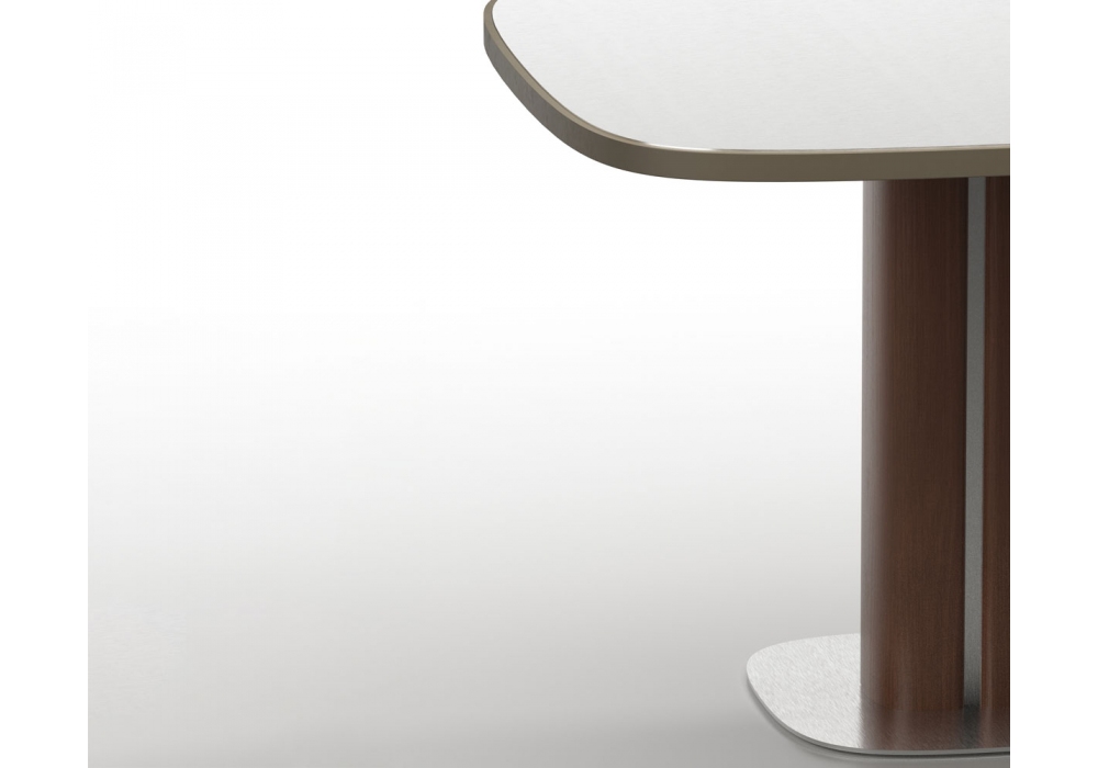 Trafalgar Square designed by Marco Piva for Casamania & Horm is a table available in two dimensions, it is made up of a top with rounded corners and a wooden base with metal inserts. This parallelepiped is positioned on a metal support plate and with a quadrangular shape but with fluid angles that seems to illuminate the entire structure.