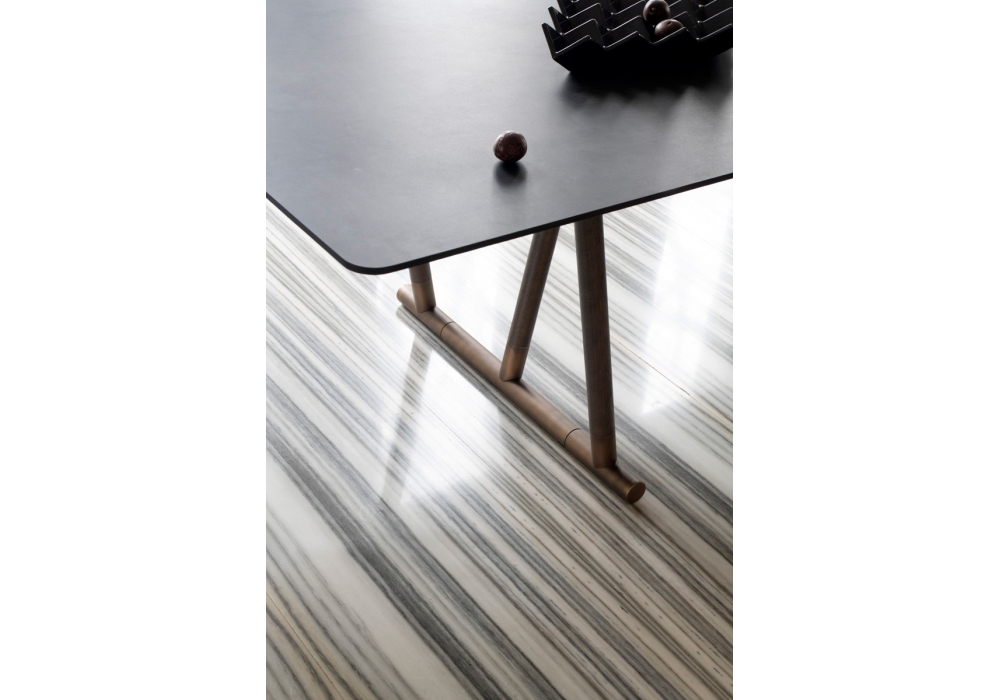 Pipe designed by Favaretto & Partners for Potocco is a rectangular table with base featuring two inverted trestles in ash and metal with burnished brass finish. The top is made of ash, low thickness porcelain stoneware or marble, rounded on the corners.