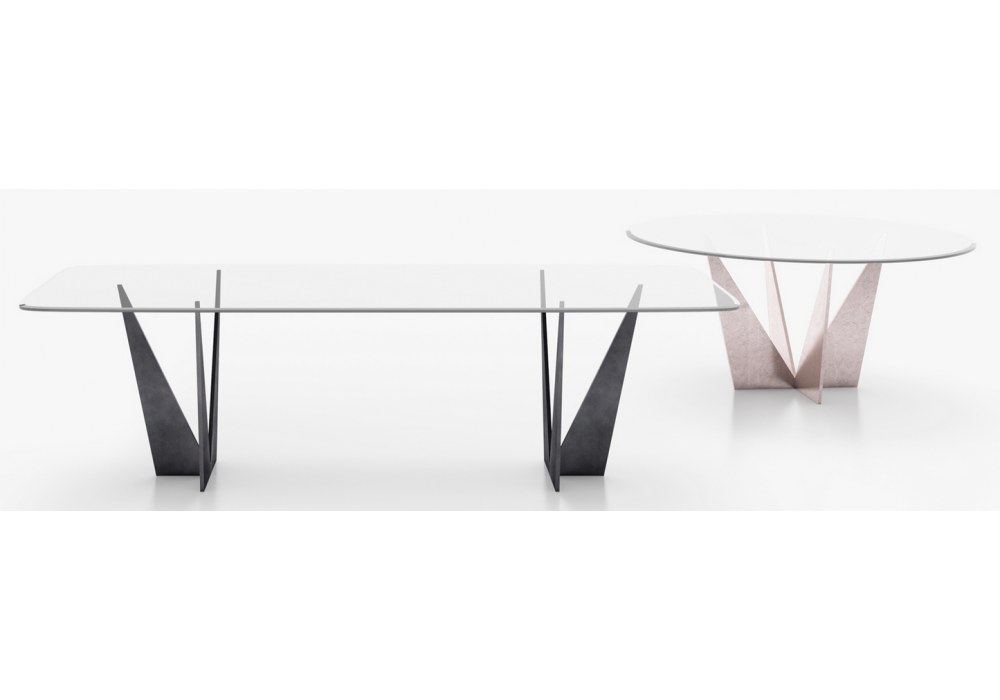 Estremi designed by Paolo Benevelli for Capodopera is a table with top made of tempered extra-clear glass and base in laser-cut sheet metal.