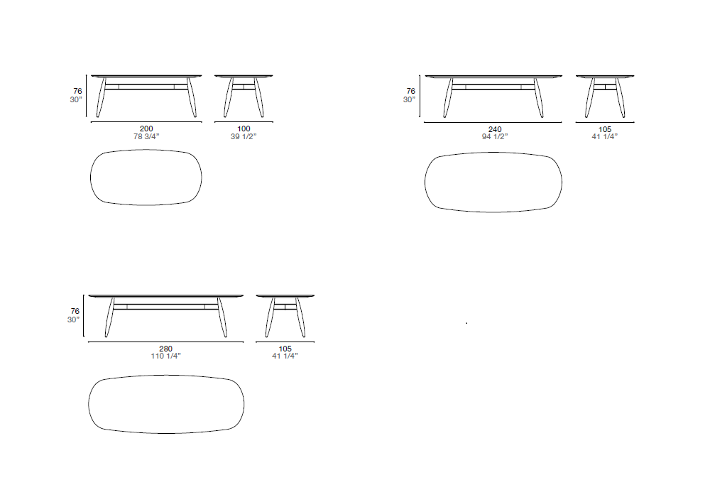 | Dimensions | 200 x 100 x H 76 cm; 240 x 105 x H 76 cm; 280 x 105 x H 76 cm. |