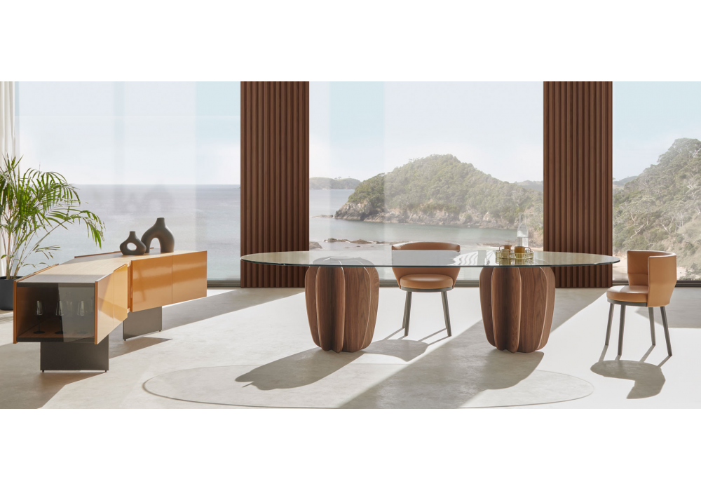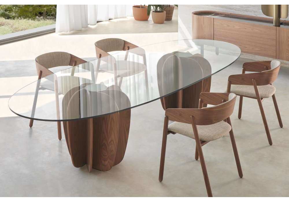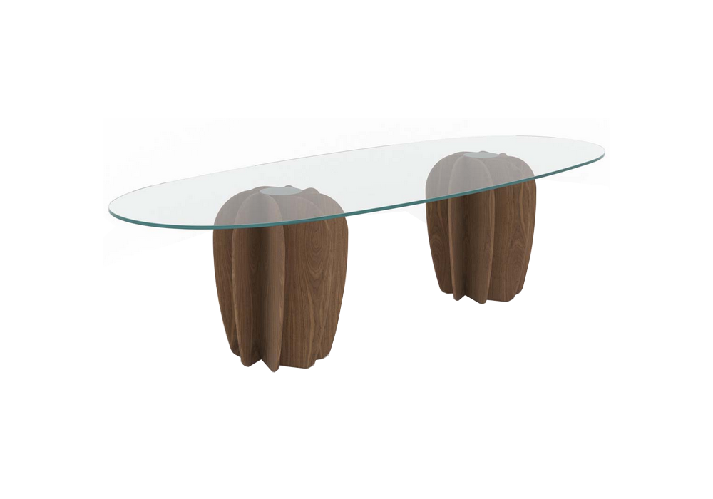 Coral designed by Arik Levy for Punt is a table with structure in walnut veneered MDF and top in transparent tempered glass, Dekton or walnut.
