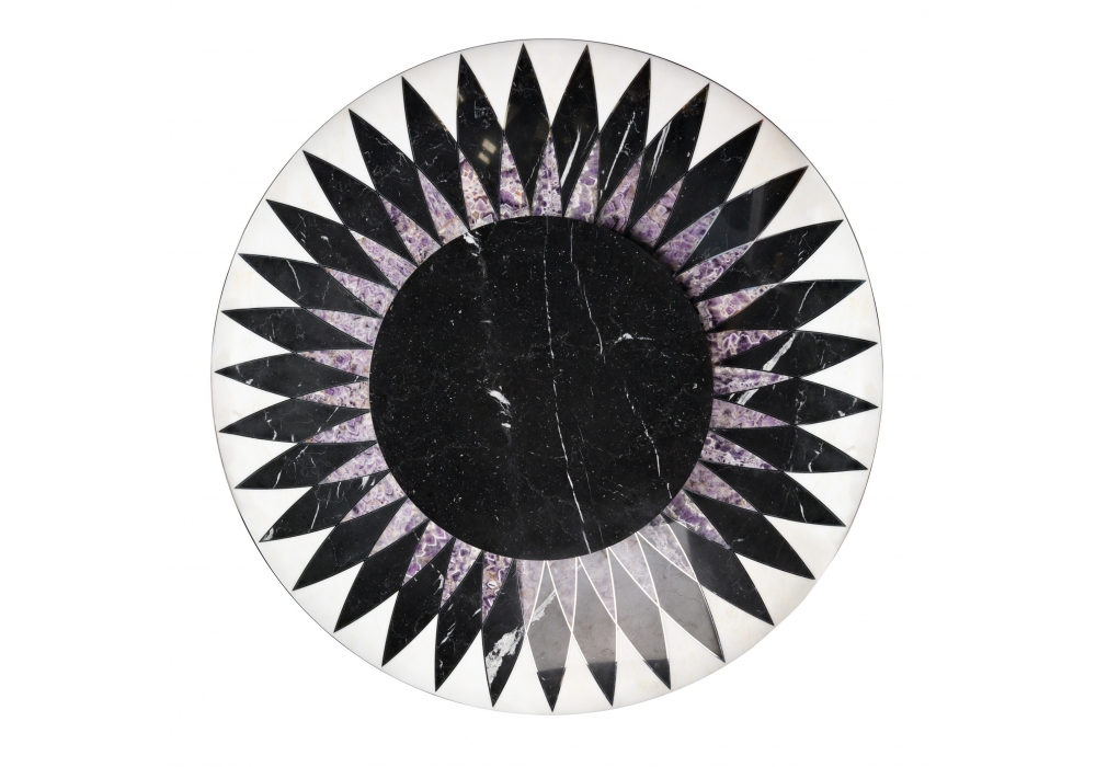 Raidho designed by Steve Leung for Visionnaire is a table with a circular top in inlaid marble with an optional marble or stone centerpiece. The base is made of circular metal. Raidho is available in different finishes and models.