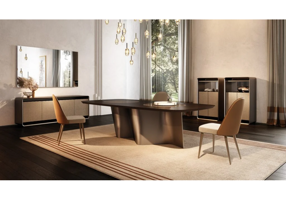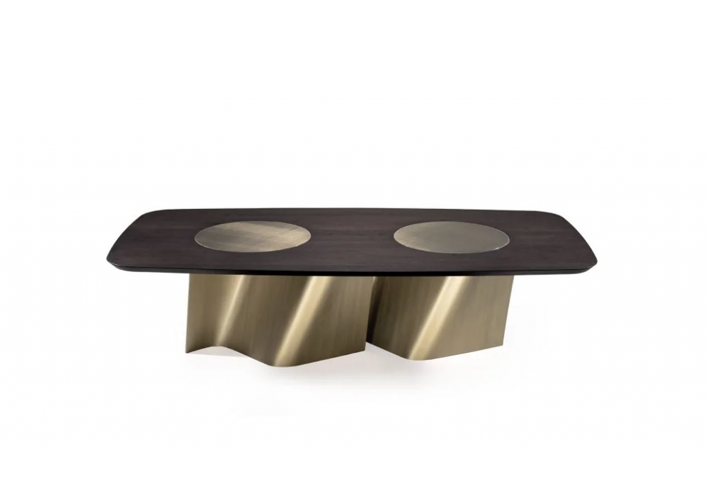 Esse 72 designed by Tulczinsky for Reflex Angelo is a dining table with bases in curved extra clear glass 15mm thick with Bronze, brass, dark brass and titanium finish. Top in transparent or in extra-clear glass or in MarmoReflex/Legnoreflex. Also available with Bevel Wood top.