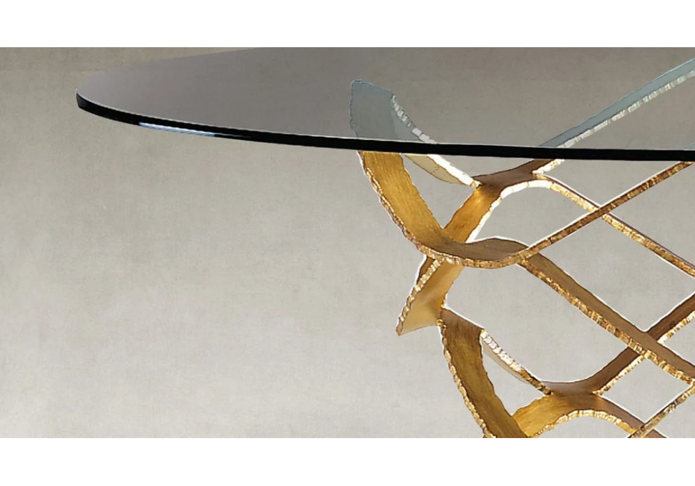 Neolitico 72 designed by Tulczinsky for Reflex Angelo is a table made with a wrought iron base with gold leaf or silver leaf finish and transparent glass top. Available in different finishes and dimensions.