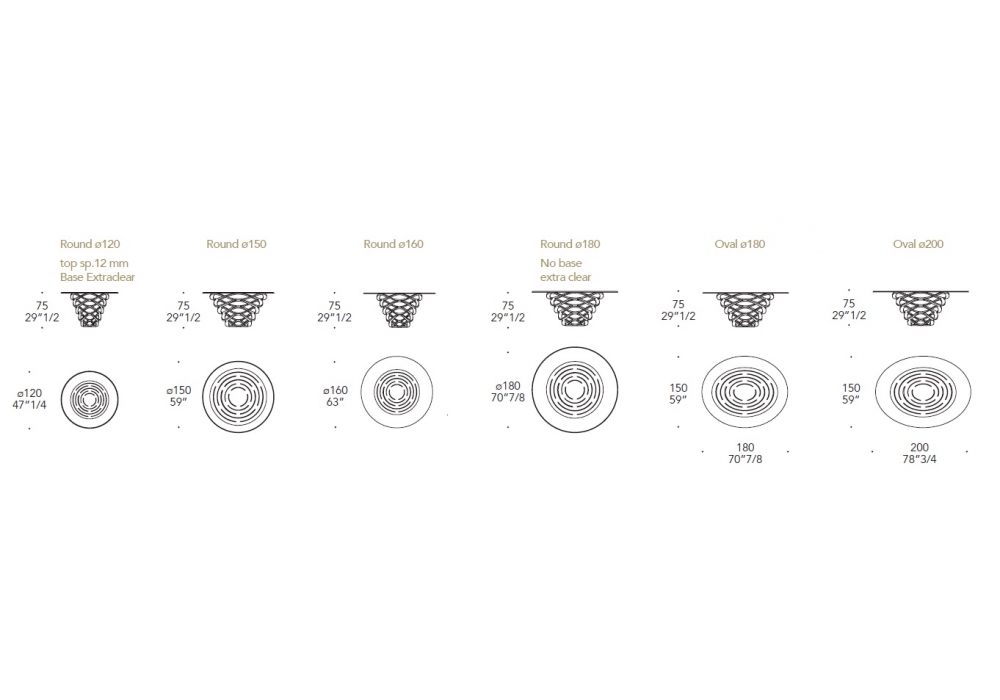 | Top | Ø 120 cm; Ø 150 cm; Ø 160 cm; Ø 180 cm; 180 x 150 cm. 200 x 150 cm. |