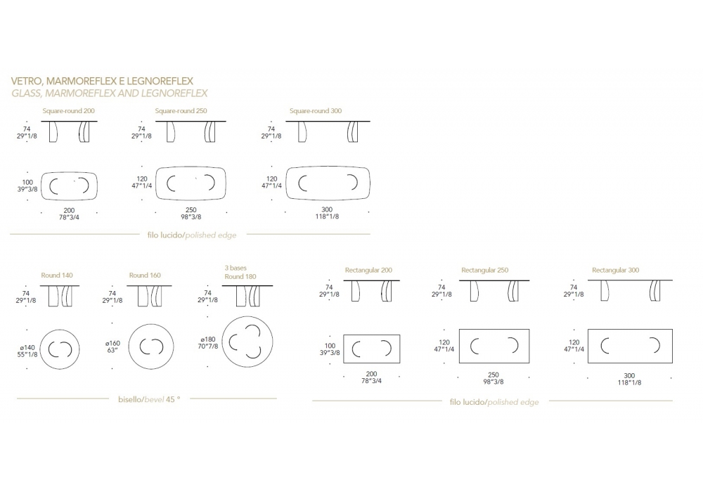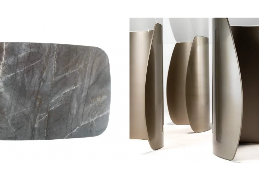 Petalo 72 designed by Tulczinsky for Reflex Angelo is a dining table with bases in extra-clear curved glass with internal Bronze finish or in satin brass, dark brass or titanium. Top in transparent glass, extra-clear glass or in MarmoReflex or LegnoReflex. Also available with Bevel Wood top in Canaletto or Canaletto Henné or with Bevel MarmoReflex top. Available in different finishes and dimensions.