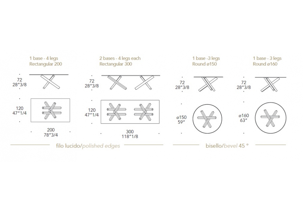 | Dimensions | 200 x 120 x H 72 cm; 300 x 120 x H 72 cm; Ø 150 x H 72 cm; Ø 160 x H 72 cm. |