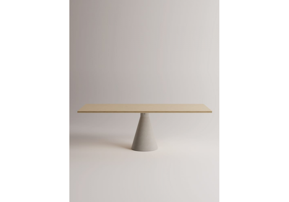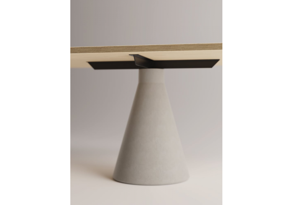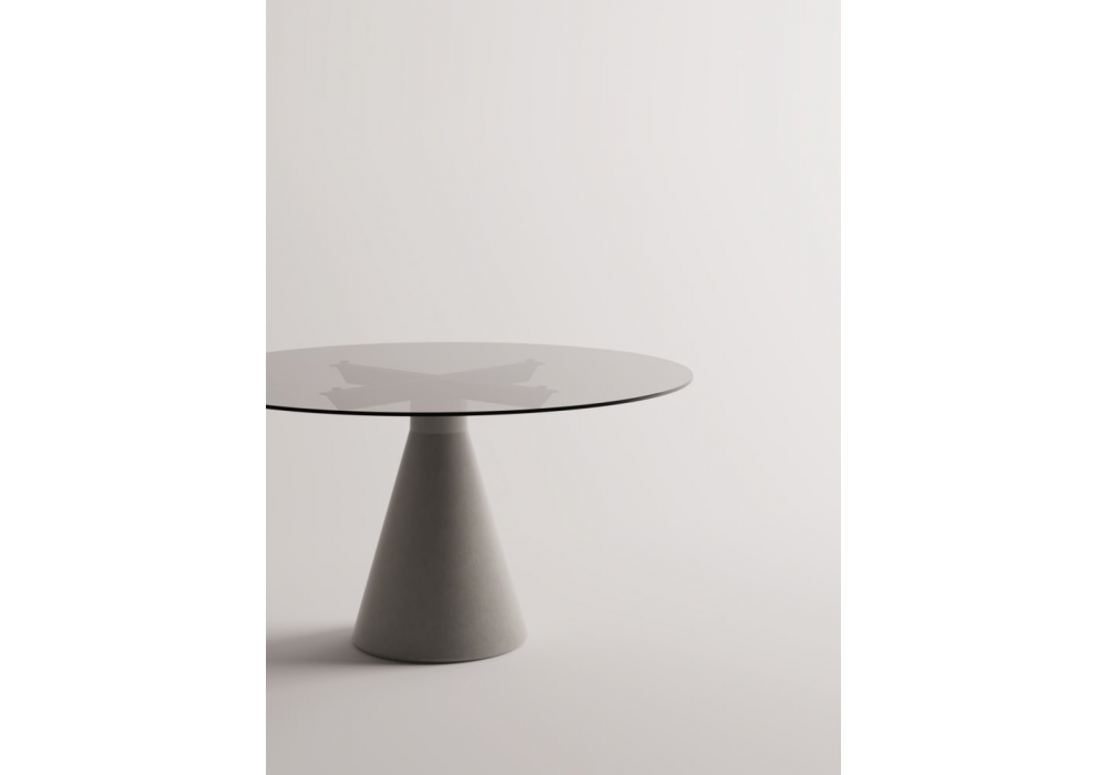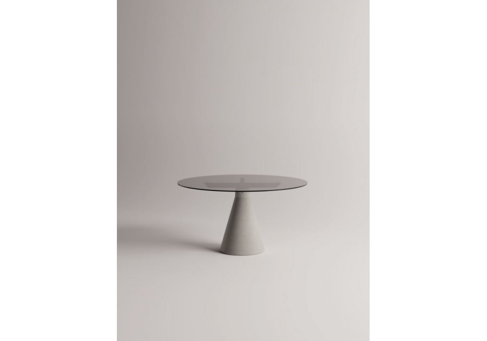 Club 44 designed by Angelo Mangiarotti for AgapeCasa is a table with a truncated cone-shaped base made of concrete; connected to the top by a cross-shaped structure in black painted steel. The top, in different shapes, is made of smoked glass, or birch plywood with exposed edge and top veneered in Slovenian oak or Forbo linoleum.