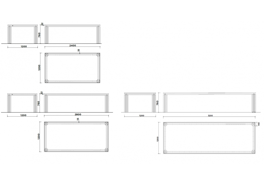 | Dimensions | 240 x 120 x H 76 cm; 280 x 120 x H 76 cm; 320 x 120 x H 76 cm |
