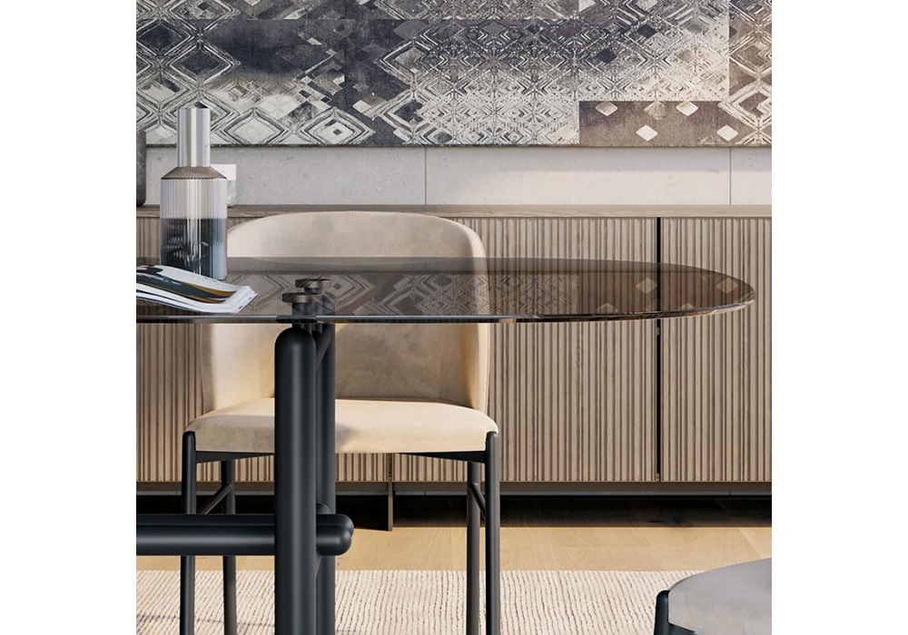Supernova designed by Signorotto+Partners for Dall'Agnese is a table made with a fixed oval top available in transparent, transparent bronze or transparent grey glass or in lacquered glass and a metal base. Available in different finishes and dimensions.