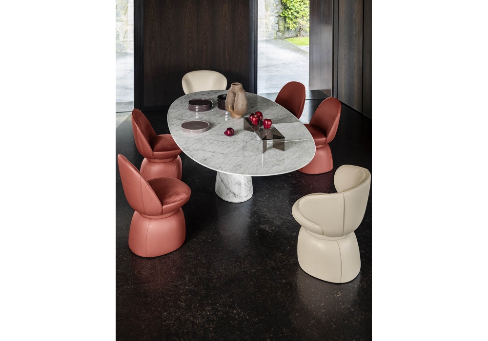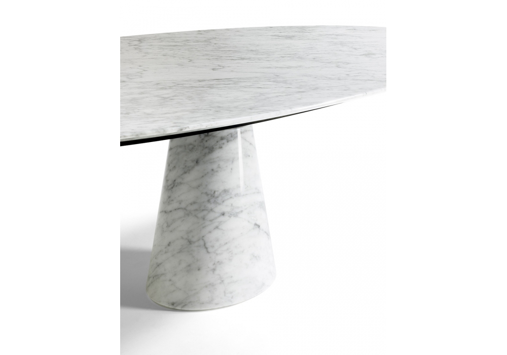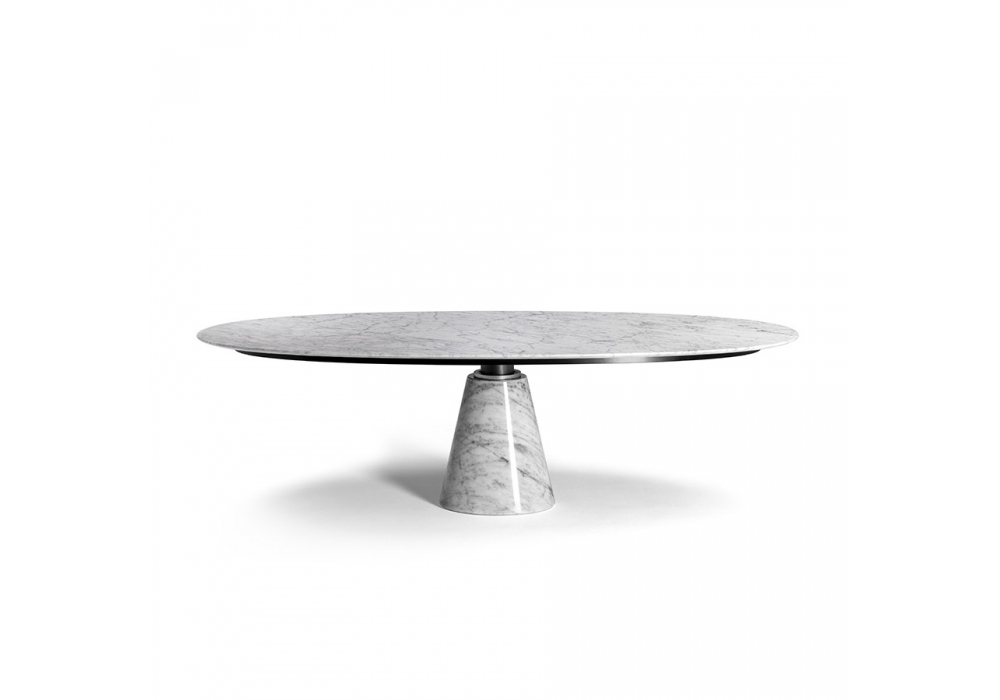 Mesa Ellipse designed by Lella & Massimo Vignelli for Poltrona Frau is a table available in various sizes and finishes, with a polished or semi-polished marble top, treated to resist liquids and ensure greater durability over time. The lower part of the top is reinforced with a technical mesh to increase its resistance. The support structure is in painted steel, composed of a tubular element and a metal frame closed by a sheet of matt black painted aluminum. The central column base is available in various materials, marble (matching the top finish), Saddle Extra leather or Pelle Frau® ColorSphere® leather (with tone-on-tone stitching).