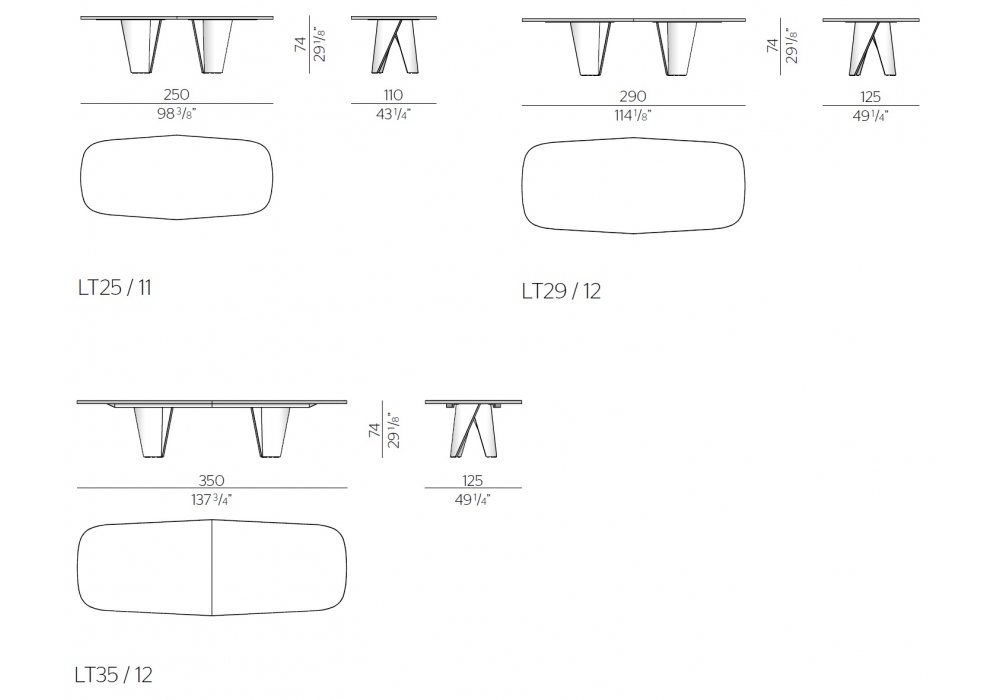 | Dimensions | 250 x 110 x H 74 cm; 290 x 125 x H 74 cm; 350 x 125 x H 74 cm. |