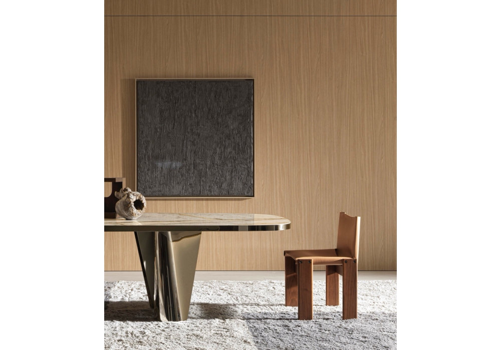 Lise designed by Christophe Delcourt for Molteni&C is a table with shiny steel structure and edge, top in stone/marble. Available in different sizes. Lise is a table of great aesthetic significance, designed to enrich the most refined and airy home spaces with elegance. Special attention to the design of the legs, a distinctive element that highlights the structure and stylistic character of the table.
