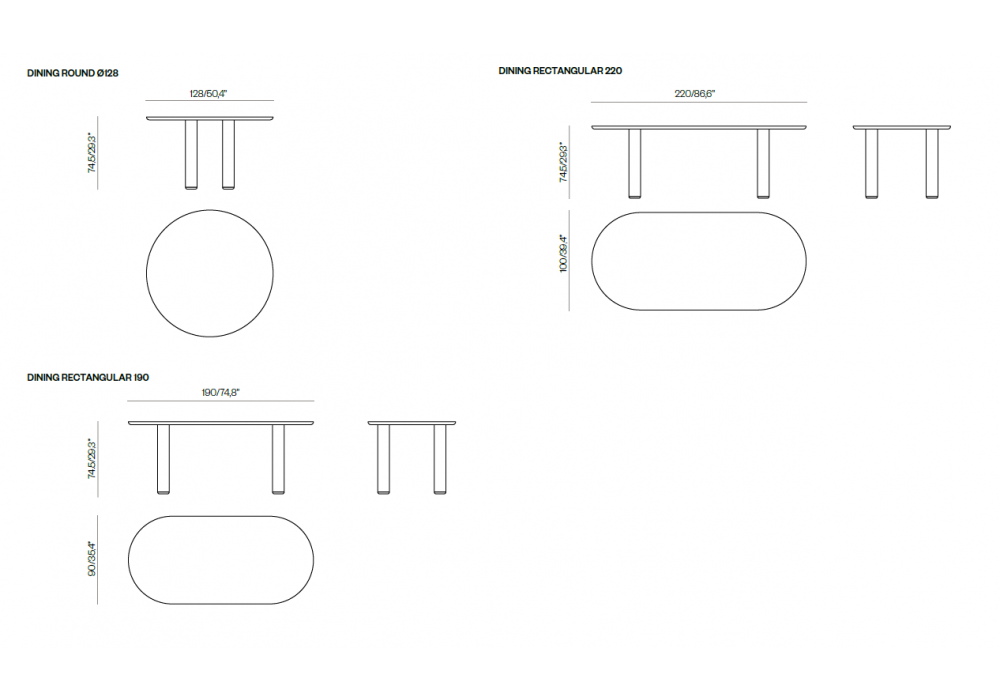 | Dimensions | Ø 128 x H 74.5 cm; 190 x 90 x H 74.5 cm; 220 x 100 x H 74.5 cm, |