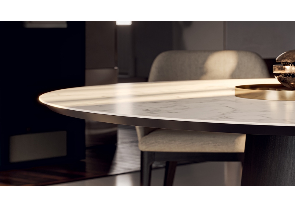 Arona designed by Kico is a round table with a central truncated cone base clad in Canaletto Walnut, available in various finishes. The 160 cm top with rounded edges is available in Ash, Canaletto Walnut, or Stoneware and can accommodate a central Lazy Susan.