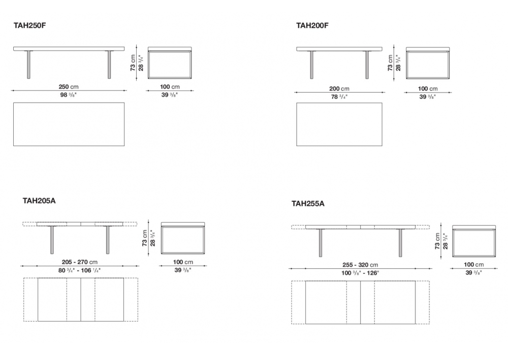 | Dimensions | 200 x 100 x H 73 cm; 250 x 100 x H 73 cm; 205-270 x 100 x H 73 cm; 255-320 x 100 x H 73 cm. |