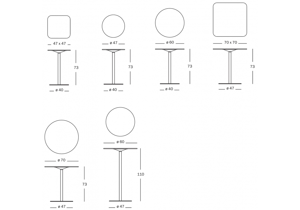 | Dimensions | 47 x 47 x H 73 cm; Ø 47 x H 73 cm; Ø 60 x H 73 cm; 70 x 70 x H 73 cm; Ø 70 x H 73 cm; Ø 60 x H 110 cm. |