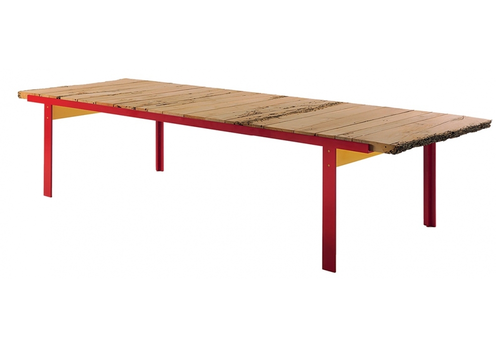 Touch designed by Carlo Colombo for Riva 1920 is a table with top made of solid Briccola wood, with side-by-side slats positioned transversely with natural-edged heads. Lacquered iron base composed of four T-section legs. Available in different finishes and dimensions.