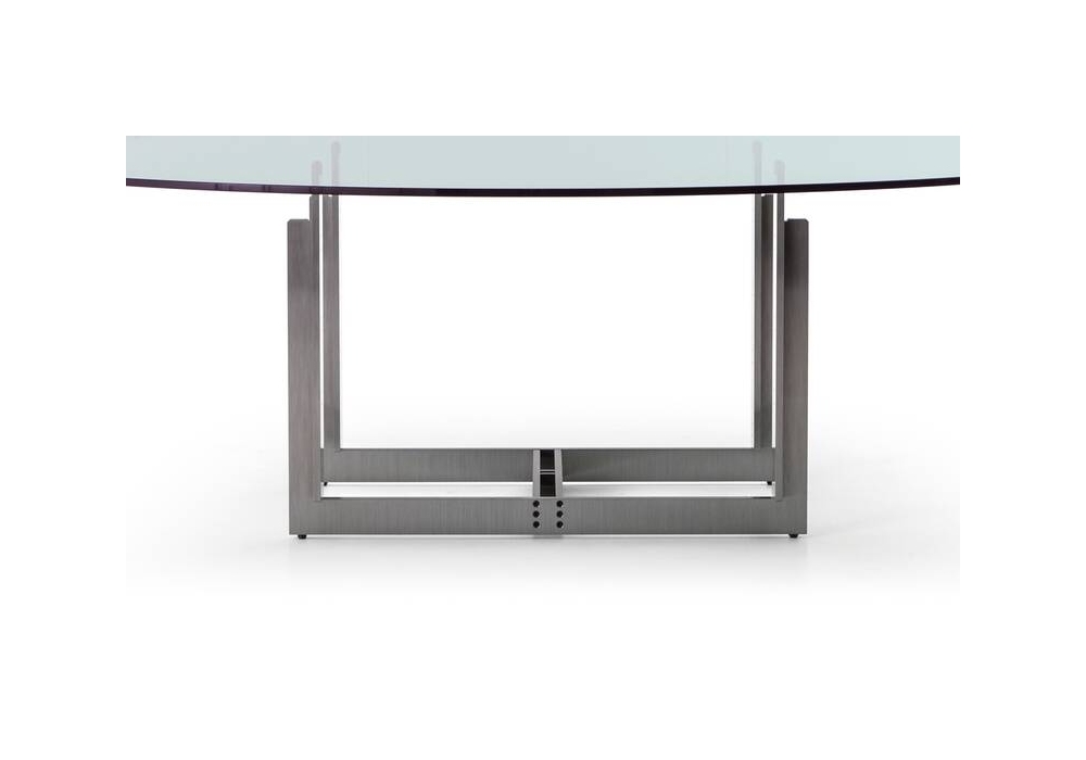 Sarpi designed by Carlo Scarpa for Cassina is a table with a satin-finish drawn metal frame, exposed burnished screws, and a float glass top with polished beveled edges and rounded corners. Available in different dimensions.