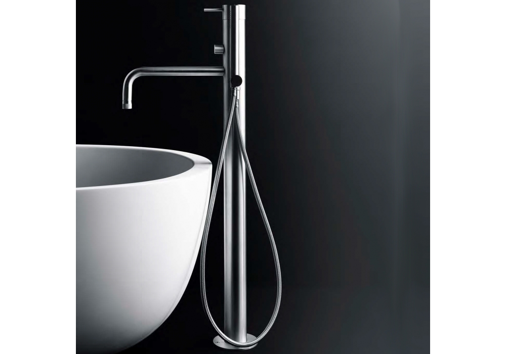 Eclipse designed by Studiocharlie for Boffi is a floor-mounted bathtub group in stainless steel AISI 304. Available in satin stainless steel and PVD gray finishes.