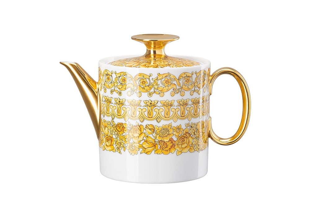 Medusa Rhapsody designed by Versace in collaboration with Rosenthal is a porcelain teapot.
