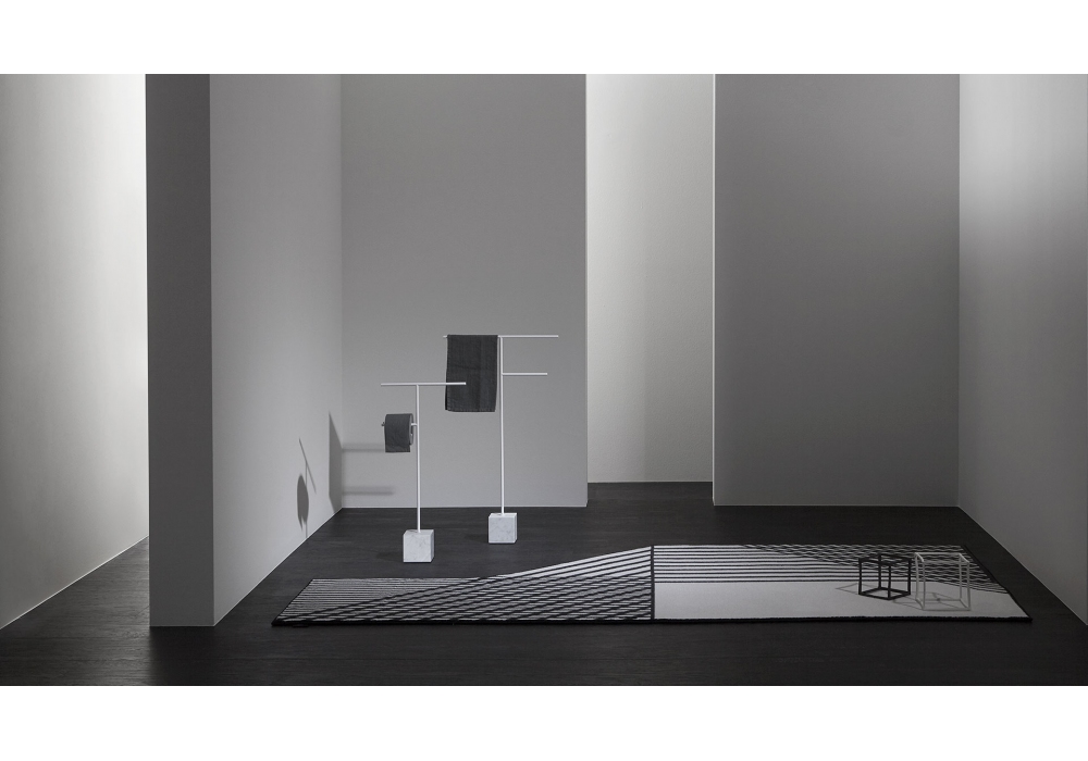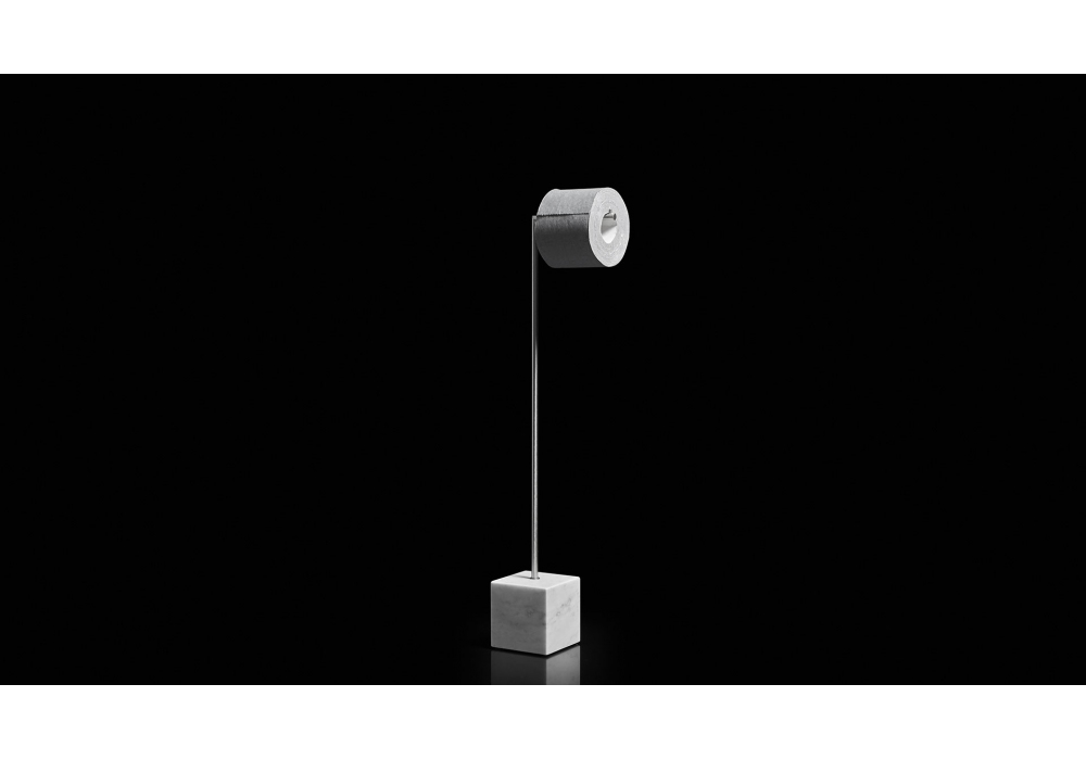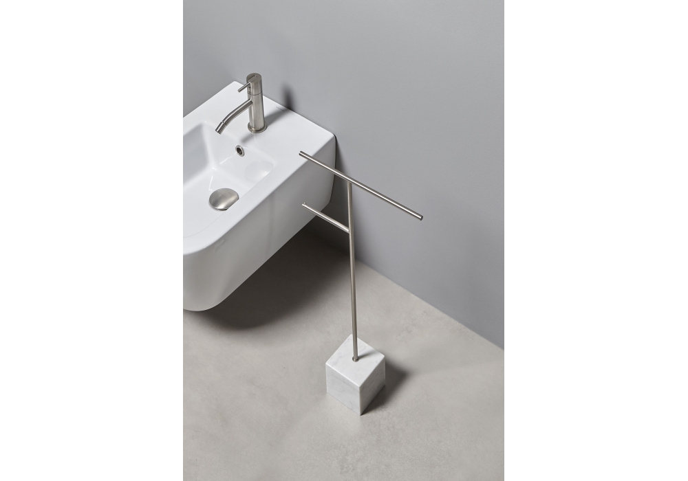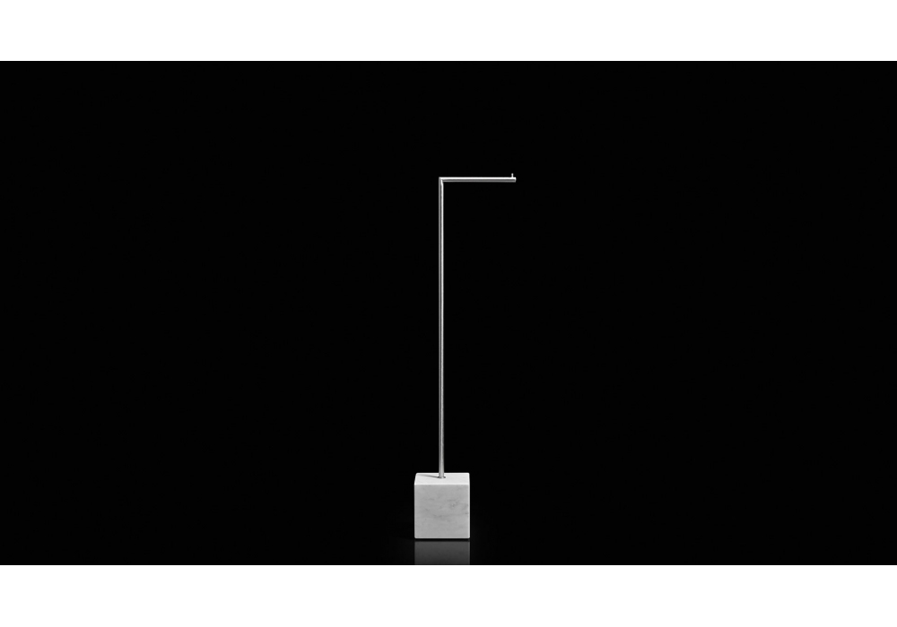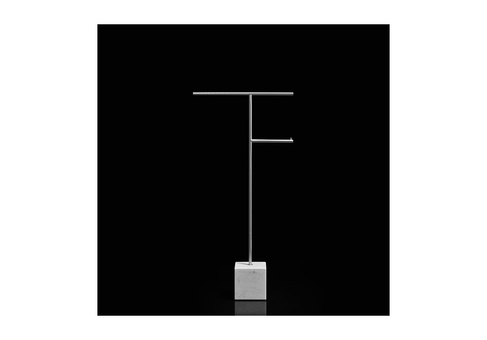 Bivio designed by Antonio Lupi is a towel holder/paper holder made with a satin marble base and painted brass structure, satin steel or polished chrome finish.