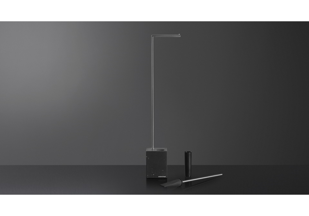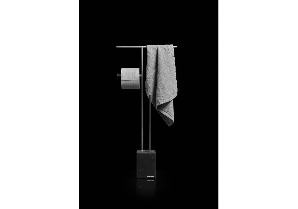 Biviocombi designed by Antonio Lupi is a paper holder and toilet brush holder with a satin marble base, a structure in matt white painted brass, embossed colour, satin steel finish or polished chrome.