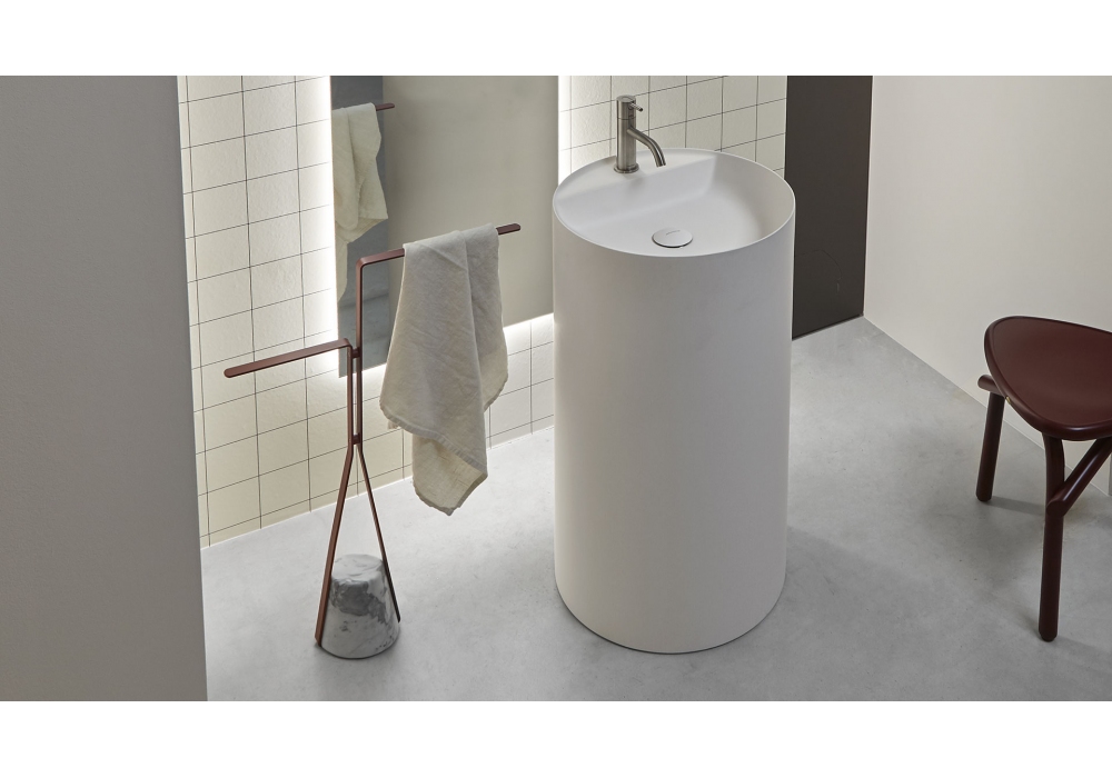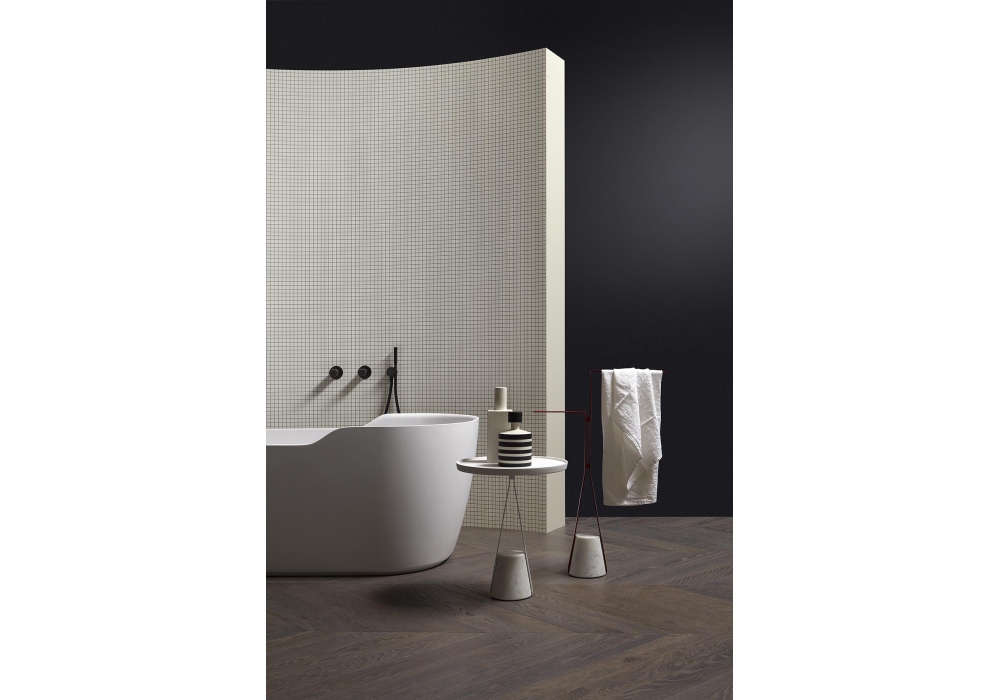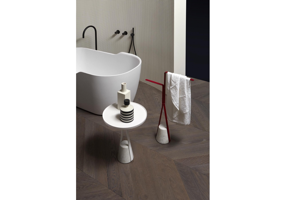Halo designed by Calvi Brambilla for Antonio Lupi is a towel holder made with a satin-finish Carrara marble base and a structure in matt white painted brass or embossed in various finishes.