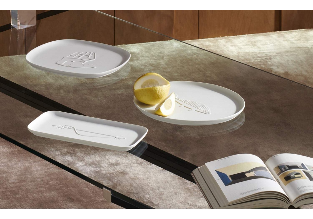 Collection Chandigarh designed by Le Corbusier for Cassina is a tray in pure unglazed porcelain, available in three dimensions and with three different symbols in bas-relief.