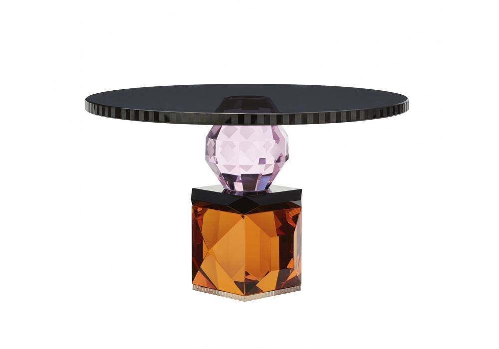Savannah produced and signed by Reflections Copenhagen is a circular cake stand in crystal structured by various carved and hand-finished geometric elements in black, pink, transparent and amber.