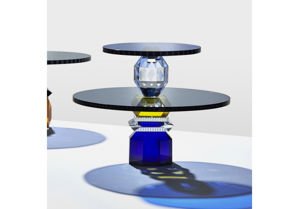 Dallas produced and signed by Reflections Copenhagen is a cake stand with several tiers in circular shape in crystal structured by various geometric elements carved and finished by hand in cobalt, transparent, black and yellow.