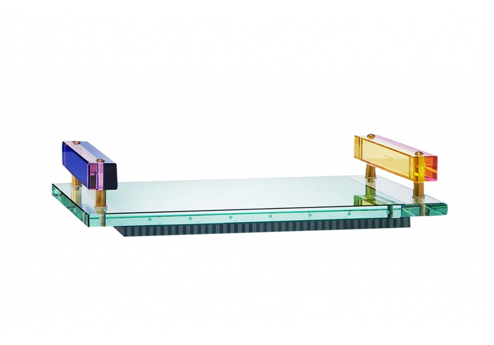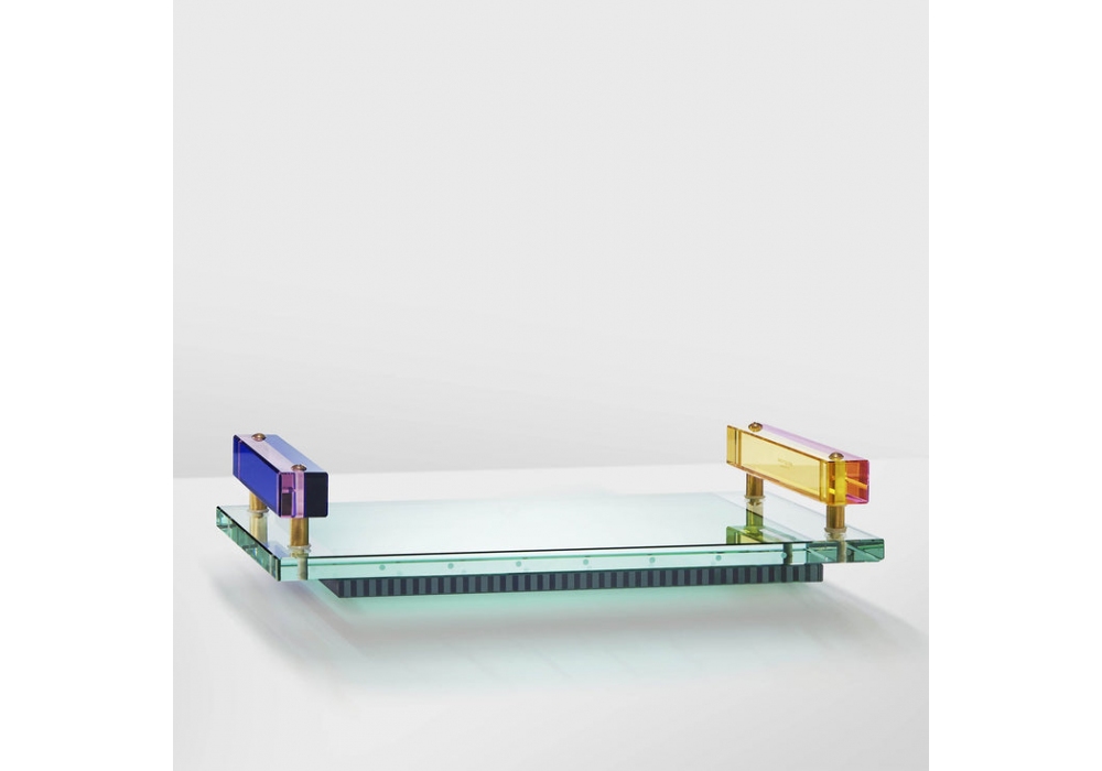 Panama produced and signed by Reflections Copenhagen is a quadrangular crystal tray structured by various geometric elements carved and finished by hand in transparent, pink, cobalt, yellow and emerald.