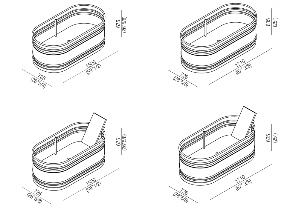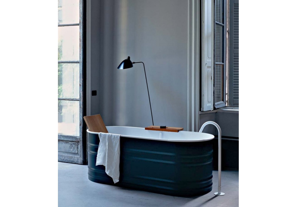 Vieques designed by Patricia Urquiola for Agape is an oval bathtub made of white painted steel or with a dark gray or light gray exterior; with white external overflow circuit. Available in two sizes and in the version with or without iroko backrest. Upon request it is possible to add an iroko storage shelf.