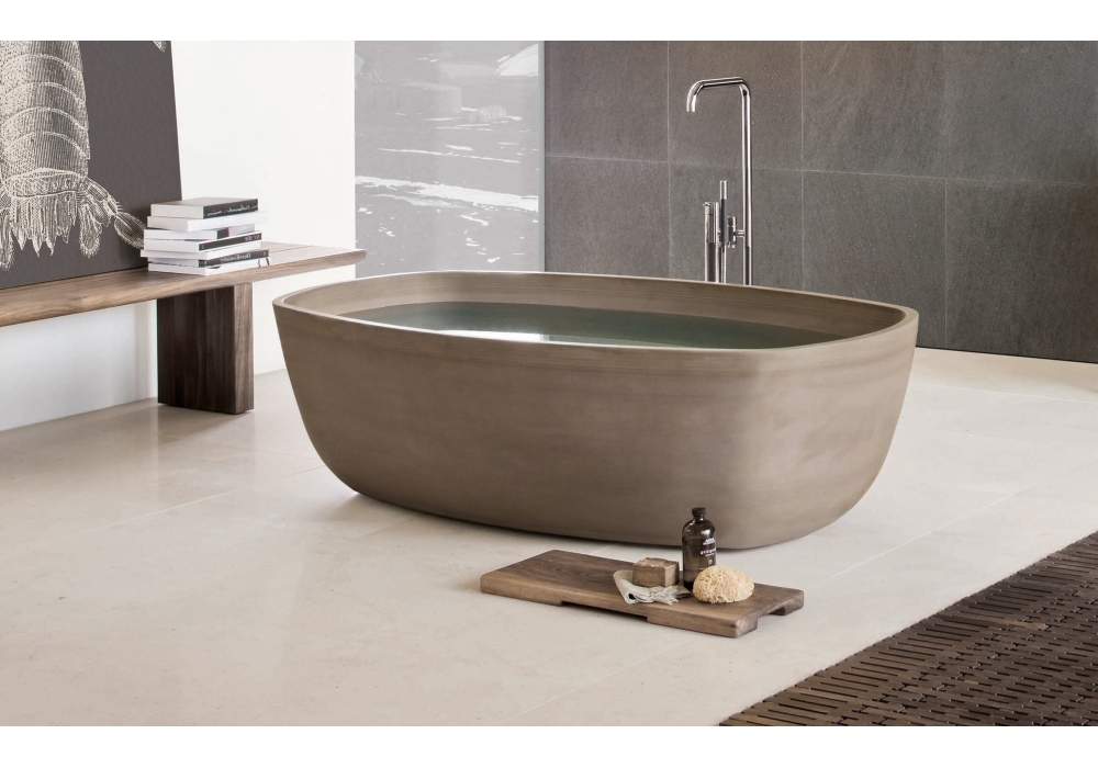 Inkstone designed by Steve Leung for Neutra is a shaped oval bathtub carved from a unique block of stone available in different finishes.